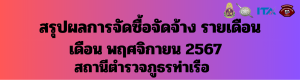 สรุปผลการจัดซื้อจัดจ้างจำแนกข้อมูลเป็น รายเดือน เดือน พ.ย.67 ในรูปแบบไฟล์ PDF คลิ๊กที่นี่